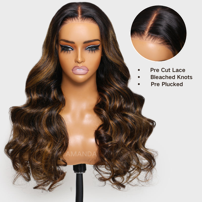 Glueless 3D Body Wave Highlight Balayage Brown 7x5 / 13x4 Transparent HD Lace Put On & Go Invisible Drawstring Human Hair Wig Amanda Hair